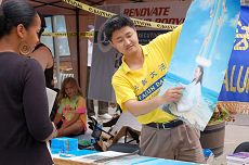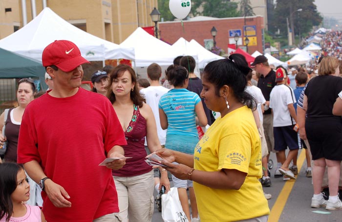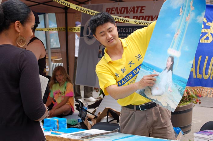 今年是庆典活动的第十二届,沿杨街两旁共有八百多个售货摊位,市民们和游客摩肩接踵,人流如潮,这在地广人稀的北美地区是难得一见的场面。街道上人流涌动,连组织者都说不清到底有多少人,估计有数十万人。法轮功学员设置了摊位,向人们讲述中共残酷迫害法轮功的真相,并发售揭露中共邪恶本质的《九评共产党》和法轮功学员的美术作品。很多行人都主动索取传单报纸,并购买书籍和画作。