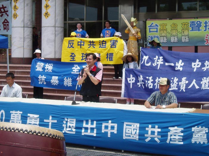 台东县前任副县长刘棹豪律师未能前来参加声援大会,但他透过林高文先生表示:当全世界的注目焦点都放在中国大陆广大的经济市场及经济潜力时,作为地球村的每个成员,都不能忽略中国经济假相背后的人权现况,如果中国大陆连最基本的宗教信仰及传播媒体的自由都没有,表示距民主社会还有很长的距离,如果未适当处理,中共会象颗不定时炸弹,让全世界产生倾斜。所以声援退出中共的活动,实际上就是全世界的和平自救活动。