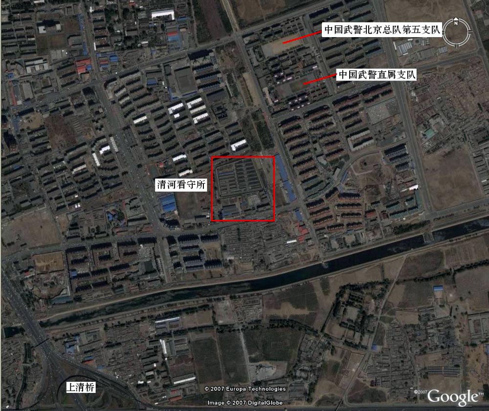 北京清河看守所位于北京市龙岗路二十五号,看守所大门挂“龙岗路25号”牌子,是北京市当局迫害法轮功学员的一个主要邪恶场所。看守所不远的东北面有“中国武警直属支队”和“中国武警北京总队第五支队”二个武警支队看押看守所。下面是通过 GOOGLE EARTH 找到的北京清河看守所。