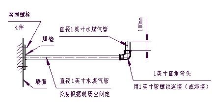 四 有时这个理想位置用“锅”自带的支架够不着,那就需要测量好安装位置,自制一个如图所示的支架,将其固定在阳台内侧的墙面上,把“锅”安装在100mm长垂直向上的水煤气管上调整好即可。