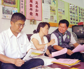 ![]() 法轮功学员代表许秀英(中)向彰化县议员黄振彦(左)、立委参选人柯金德(右)讲述港府非法遣返事件始末 |