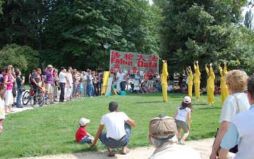 六月三十日是开幕式,法轮功学员向游园者演示了五套功法、传统的中国舞蹈和腰鼓,同时还向人们介绍了这个美好的功法在中国正无辜遭受残酷迫害的情况。
