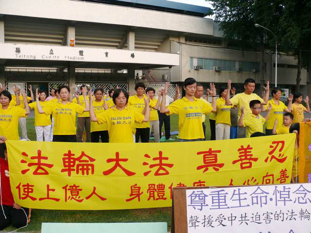 ![]() 台东法轮功学员集体炼功,展示法轮功五套功法 |