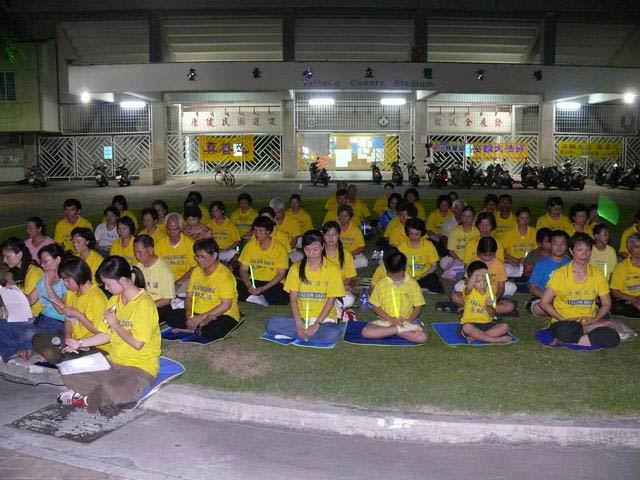 法轮功学员随后在晚间七点二十分手持烛光静坐,并以诗歌及音乐悼念被非法迫害致死的大陆学员。
