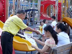在体育场前炼功的学员,有老有少,法轮功学员林先生说,他的身体原来有多种病症,但在修炼后整个人脱胎换骨;就读小学三年级的玮玮说,他每天早上和妈妈一起到体育场炼功,炼完功后感觉精神特别好,在学校和小朋友相处,他也会记住要真善忍对待同学。玮玮的妈妈则补充说,每天晚上写完功课,他还会上电脑,但不是打电动游戏,而是去跟中国大陆的大朋友聊天讲真相,告诉他们法轮功真的很好,请他们不要听信中共的谎言。布农族原住民高女士也带四个孙子一起来参加集会。