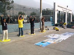 国立古斯曼山谷教育大学在郊外的四十七公里处。十七日早上八时,学员们陆续从各地集中在大学的门口。这天是该校全体教师参加全利马教师大游行,停止了许多课程。因此大学门外显的有点冷清,法轮功学员并不气馁,继续摆放真相图片,向每个过路的人发放传单。说来也巧,下午,法轮功学员在校园内邂逅了几百名将要出发参加游行的该校教师和工作人员,向他们每个人发放法轮大法真相传单及西文版的大纪元报。教师们惊叹于真相传单和大纪元报所说的,与他们平时所看的所了解的中国大陆官方的信息非常不同,认为这些才是真实。他们非常感激学员给他们带来了真相,纷纷表示要认真去了解法轮功,有的签名表示支持法轮功。