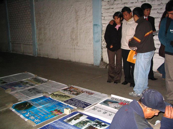 十八日早上八时,法轮功学员来到国立工程大学。该校位于利马市区,正门向着车水马龙熙熙攘攘的大街。大学门口侧面的跨大街天桥,今日成了悬挂“法轮大法好”“真善忍”横幅的最佳场地。学员把真相图片对着大街,挂在大学外的围墙上,图片还未等挂好已经围上一层观看图片的民众。可能出现拥挤的人群引来大学的保安关注,保安告诉学员围墙是属于大学的,悬挂图片需要申请。并告知摆放在地上是自由的。当学员摆放好图片后,发现保安增多了,他们不说话只是看图片和索取传单和报纸。之后,来了一位警察说需要办理申请。学员对警察说,这地方是自由的,我们在这里活动只有一天的时间,主要是告诉人们中共迫害法轮功的真相。警察点头离开去看图片。有的教师仔细看了真相图片后,向学员购买了西文版《九评共产党》一书,表示要彻底的了解中共的邪恶本性。