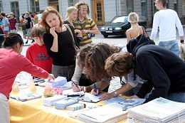 这两天来自中国大陆的游客显的特别多。学员们普遍感到:今年大陆来的游客变化很大。越来越多的中国人都愿意看《大纪元时报》、《九评共产党》和其它一些真相资料,有的人站在横幅、展板前仔细的观看思考,还有的人主动上前和学员交谈。有一对中年夫妇,他们接过报纸又双手还给学员,表情认真的对学员说,“我有突破封锁的软件,我什么都能看到,我知道你们的资料是很珍贵的,把这些资料还是留给其他的中国人吧,他们很需要!”当提到退党大潮时,那位男士高兴的说,“我们早就在大纪元退党网站上退了!我认为大纪元这种退党形式,很适合我们现在在中国的处境。非常好!谢谢你们!放心,我知道对我们周围的亲朋好友该怎么做的!”
