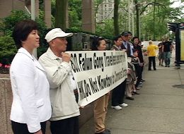 ![]() 法轮功学员在香港经济贸易处举横幅抗议:“香港,不要向中共屈膝” |