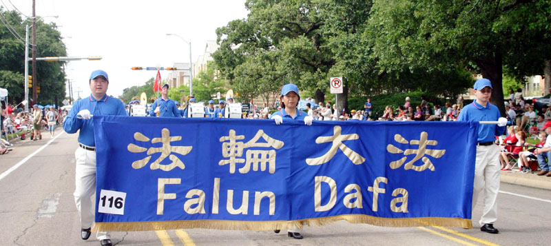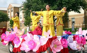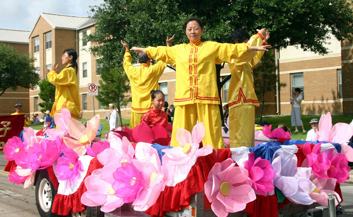 由德州休士顿市(Houston)、达拉斯市(Dallas)、奥斯汀市(Austin)和圣安东尼市(San Antonio)的法轮功学员组成的天国乐团首次亮相于大游行队伍之中,学员神采奕奕,身着蓝衣蓝帽白裤白手套,肩跨白鼓,手持金光闪亮的各种铜管乐器,令市民惊喜,耳目一新。法轮功游行队伍还包括花车上身着金黄色炼功服的学员,祥和清新,引人注目。第二次参加该游行的法轮功队伍是其中唯一以华裔为主的团体。