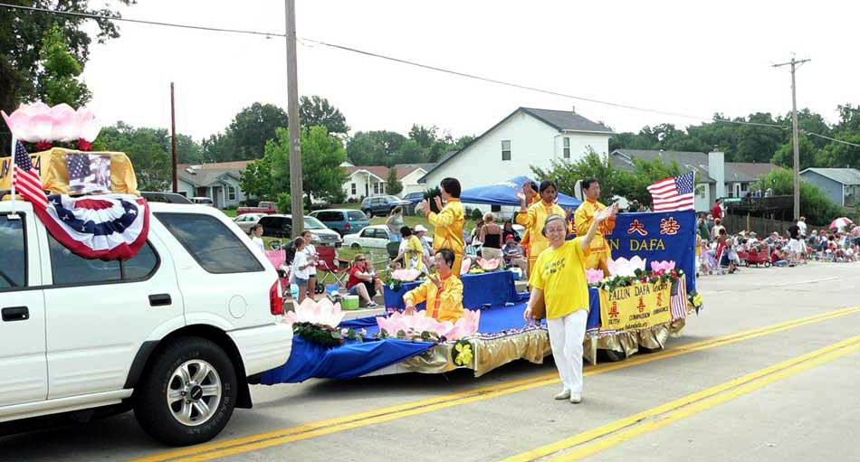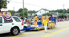 参加游行的团体很多,法轮功学员的花车排在后面。天籁般美妙的“普度”音乐、醒目的横幅和“真、善、忍”牌匾、祥和优美的功法演示,让人们在游行队伍的最后发现了惊喜。路旁的人们,不论男女老少,都目不转睛的看着。有不少人赞叹道,“Awesome!” (太棒了!)“Pretty!”(很美!)“Very Nice!”(很好!)“Thank you!”(谢谢!)有的观众情不自禁的模仿起花车上学员的炼功动作,有的合十向法轮功学员致意。