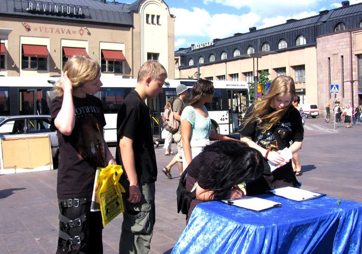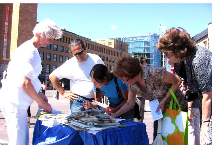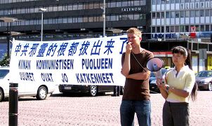 • 丹麦学员中使馆前抗议恶党绑架武汉大法弟子(图)