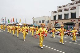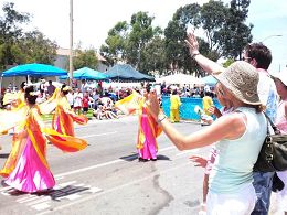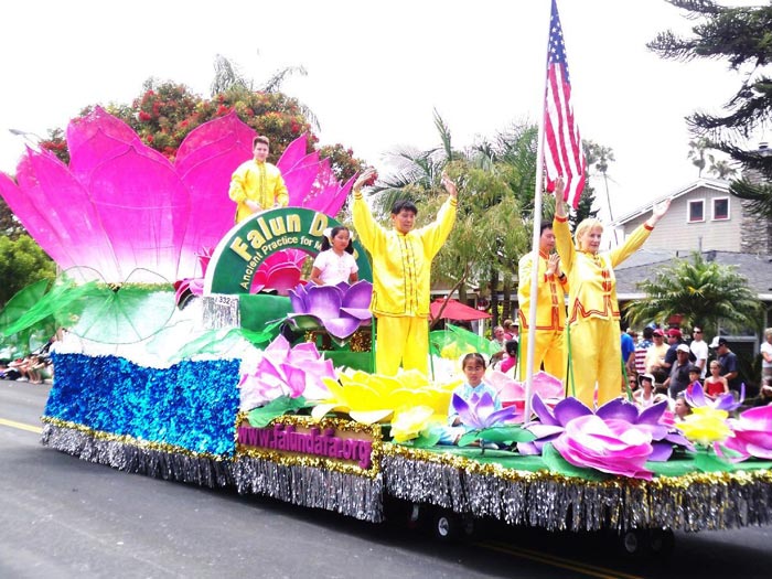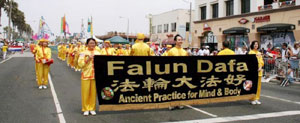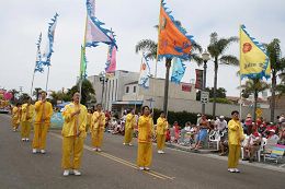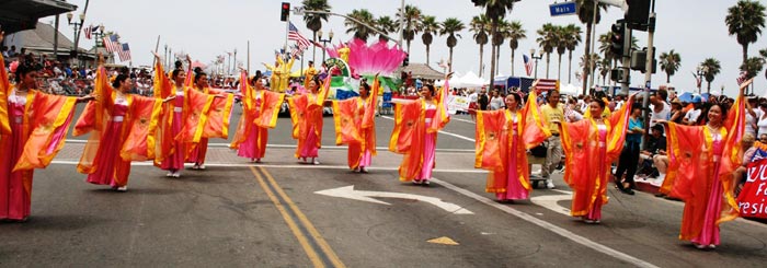 【明慧网二零零七年七月六日】二零零七年七月四日,法轮功学员参加了在加州杭亭顿海滩(Huntington Beach)举行的第一百零三届庆祝美国独立日游行。腰鼓阵、仙女舞、装饰着巨大莲花的花车,以及花车上的功法表演等与众不同的演示引起观众的极大兴趣。解说员在广播里向观众介绍法轮大法时说,这是在以传统的中国美德来庆祝美国精神。