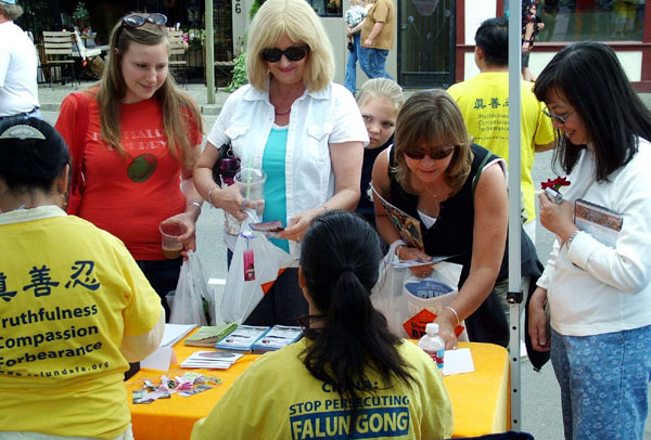 也有不少人想进一步了解中共对中国人民的迫害史。有一对夫妇带着孩子来到摊位前,说他们在报纸上看到对法轮功的报导,希望得到更多学习法轮功的资料,并深入认识中共的历史。那位男士表示他是历史系毕业的,对此非常有兴趣。交谈后,他们满意的带着《九评共产党》的DVD离去。一家从大陆来的人,年老的母亲曾经在大陆学过法轮功,迫害开始后就不敢炼了。此次女儿带着母亲来,希望母亲能重新再学法轮功,而她自己在听学员讲真相后,声明要退团、退队。