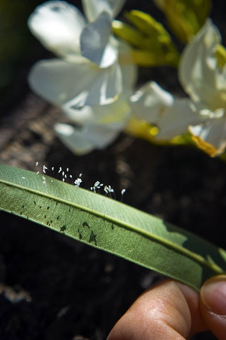 当天早晨八点多,家住美国加州的韦丽沙女士与女儿杨天慧等五人一起去明慧学校。当经过一株盛开的夹竹桃花丛时,五岁的天慧忽然看见优昙婆罗花长在夹竹桃花的叶子上,就告诉了身边的妈妈。顺着女儿手指的地方,韦女士惊喜的看见了长在夹竹桃花叶子面上细小的白色小花。