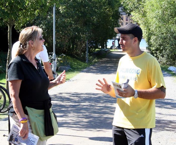 一位来自瑞典斯德哥尔摩的女士,陪着家里的客人到这里来参观,当她和她的朋友在博物馆的入口处排队时,一直在观看法轮功学员的功法演示。她被法轮功优美的音乐、舒缓的功法演示深深的吸引。于是她很抱歉的对朋友说:“对不起!我不能陪你们進去了,我要学法轮功。你们参观完出来到这里来找我吧!”于是她走上前跟着学员认真的学了起来,后来还索要了所有的有关法轮功的资料以及炼功点的具体地址。她对学员说:“今天我很高兴,我感觉太美好啦!这是上帝给我的恩赐!”