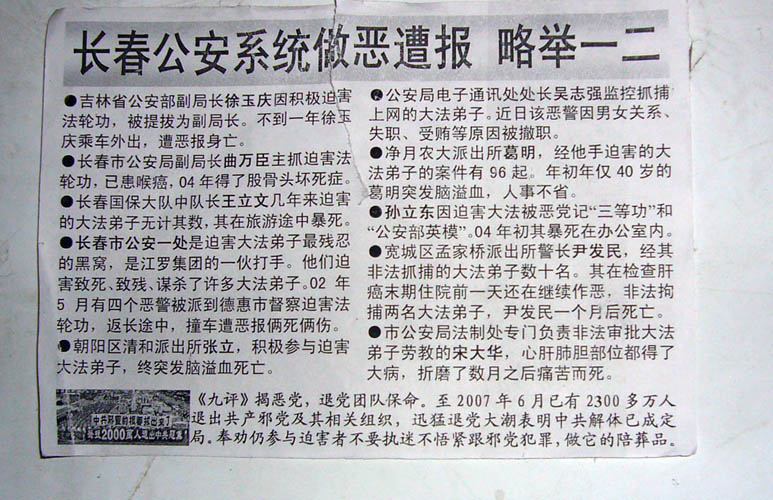 第二天,恶警又绑架大法弟子宋吉威、诱骗、绑架白金芳,警察把人带到孤山公安局后隔离迫害。大法弟子曹英被逼流离失所。