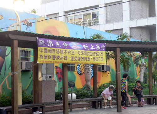 ![]() 芦洲市各里的休闲公园也悬挂「小心境外器官移植风险」的文宣 |