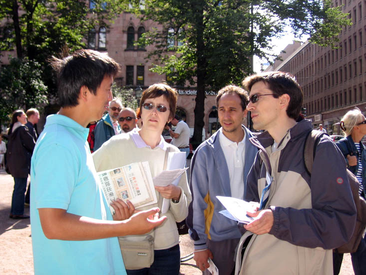 一位芬兰老年男士对学员Anija说,他退休前曾多次去过中国,对目前的迫害也有所了解,但他不理解为什么各国对中国现在发生的事却视而不见。他妻子是一位退休的器官移植医生,看到揭露中共活摘法轮功学员器官的横幅和展板时说:“应立即制止这种罪行(活摘法轮功学员器官)。你们做的非常对!”并立即和先生前去签名声援反迫害。