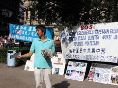 旅游旺季的夏日芬兰,各国游客川流不息。上午十点义工和学员刚来到公园布置展示现场的横幅、展板、和征签台,就看到络绎不绝的游客走过,忽听一位拎着行李的女士说:“法轮功,法轮功!”只见她直奔征签台,拿起笔就签名,学员问她从哪里来?她说:“瑞典”。