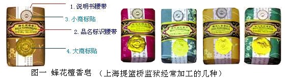 在上海提篮桥监狱的二监区大门口,经常能看到一些大卡车在装卸大量的香皂等洗涤产品。卸下的是半成品,装去的是整箱整箱的成品香皂等。半成品的蜂花(bee & flower)香皂要在监狱被关押人员的手中完成它最繁琐的一道工序:粘贴两根腰带式产品说明书和品名标识(图一1和2),再粘贴两个圆形商标贴(图一3和4)。