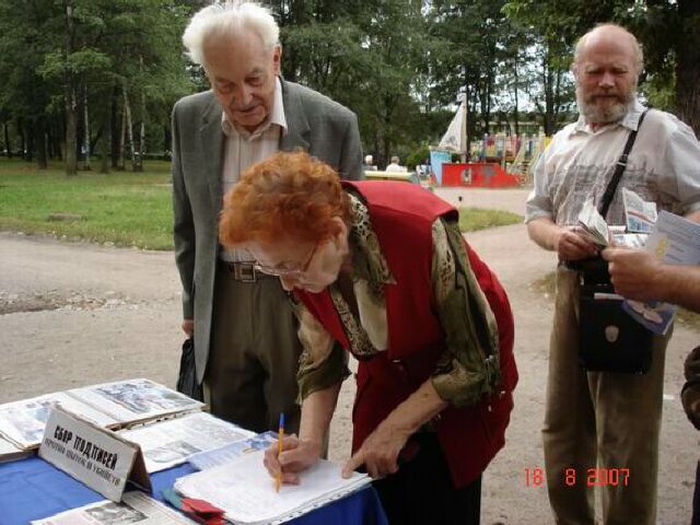 八月十一日,法轮功学员在阿维尔托罗夫(aviatorov)公园,以模拟演示的方式,揭露中共活摘法轮功学员器官牟利的罪行。一位在二战时曾被关進过纳粹集中营的老年妇女说,在集中营里发生过一些囚徒的金牙被强行摘取的事情,但简直不敢想象今天在中国竟然发生活体摘取器官牟利的事情,中共比法西斯还残暴。一些人对学员说:敢于向社会公开揭露中共这么凶残的犯罪集团,你们真了不起!