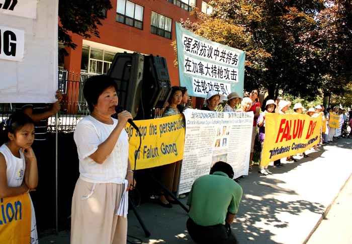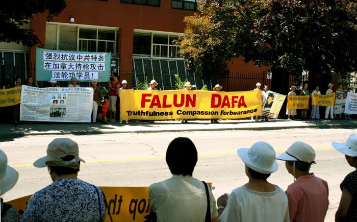 ![]() 多伦多法轮功学员中领馆门前集会,强烈谴责中共将迫害法轮功延伸到海外。 |