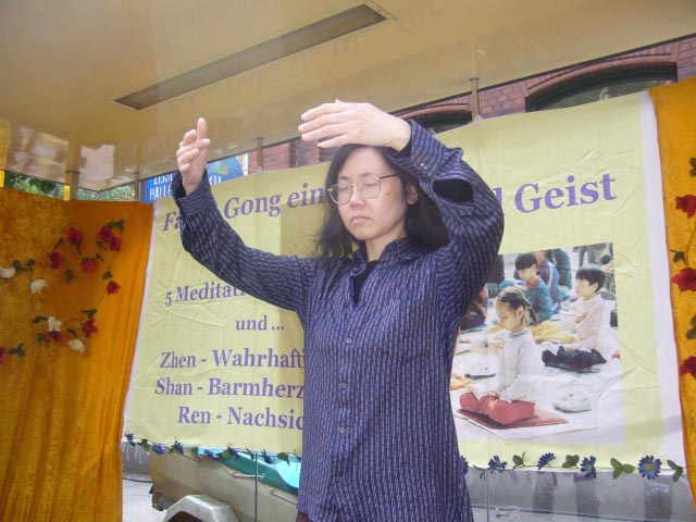 法轮功功法的展示也非常吸引人。每次展示炼功时,参观者都抱着极大的兴趣观看,有的很久也不离开。有的详细询问法轮功的特点、作用以及在哪里能够学功。