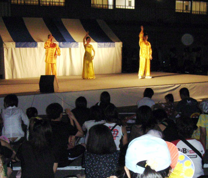 这是法轮功学员第一次参加小山市的大型节日活动。演出在傍晚开始,学员们表演了深受市民喜爱的民族舞蹈“扇子舞”、古典舞蹈“花仙”、“金光千手佛”,演唱了法轮功学员创作的“迎春祝愿歌”、“梦醒”、“为你而来”等歌曲。在展示法轮功功法时,主持人除做日文解说外还特别做了中文解说并讲解了法轮功在中国无辜遭受迫害的真相。