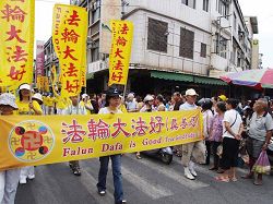 游行队伍中有“法轮大法好”横幅及法轮大法五套功法演示,并有揭露大陆法轮功学员被中共活体摘取器官的惨烈事实。善良的当地民众喜爱法轮大法的美好,并对中共以残暴手段迫害法轮功感到愤慨。