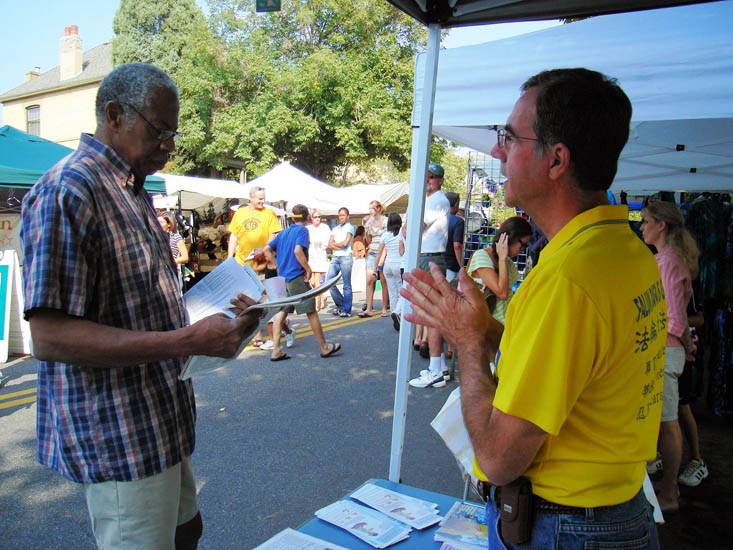 活动中不乏主动来听真相的中国人。其中一位男士刚来美国不久,听完法轮功学员讲真相后,他连连点头,并表示这些真相在国内是看不到的。学员告诉他,既然已经来到国外,那就珍惜机会多了解外面的世界在发生着什么。这位男士用自己随身携带的相机拍下了法轮功学员的摊位和西人学员炼功的场面,同时拍下了一些正在展示的真相图片。学员告诉他现在已经有二千五百多万中国人退出了中共,劝他快看“九评”,退出中共。他说“九评”他在电子邮箱里收到很多,他回去会看。讲到退党,他表示:共产党太厉害,他怕他签名退党,等回国要被抓进监狱里。学员告诉他可以用化名,他回答说:“我心中有太多的恐惧,化名也不敢签。”离开后不一会儿,他又回到了法轮功学员的摊位,问一位西方学员炼功后的感受。后来西方学员也劝他快快退出中共邪党,并对邪党的本性进行了透彻的分析。旁边另一位学员笑着对他说:“你看人家西方人怎么能把中共看的那么清楚,那就是因为看了九评。”这位男士临走时认真表示,他对退党的事会考虑。