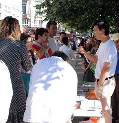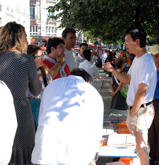 【明慧网二零零七年九月十三日】二零零七年九月八日星期六,法国法轮功学员在巴黎繁华的商业中心Chatelet les Halls旁的无辜者泉水广场(Place de la Fontaine des Innocents),用图片展、散发真相传单等方式,向当地民众和行人揭露中共