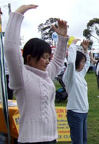 人们纷纷到法轮功学员的摊位拿资料,并签名声援反迫害。有趣的是,一大早,三位前几年来学过功的小朋友,又来到摊位。其中一位小孩的爸爸也来了,他说去年他儿子学完法轮功后,就回家与他分享炼功的感受。这三位小朋友再一次兴高采烈的学炼功法,并表示下午再来。