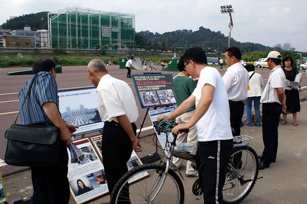 【明慧网二零零七年九月二十八日】二零零七年九月二十六日,在韩国首尔安养川市民公园,举行了华人华侨庆中秋歌舞联欢会。在会场入口到地铁出口的一公里路段,有一道特殊的风景格外引人注目——“天国乐团”的演奏配合二、三百名退党服务中心工作人员及法轮功学员讲真相、劝“三退”活动,让上万名华人眼前一亮。特别是当人们声明“三退”(退出中共党、团、队)时感到很高兴,他们认为这样做是为中国社会走向美好未来尽了自己的一份力量,是一种真正爱国的方式。