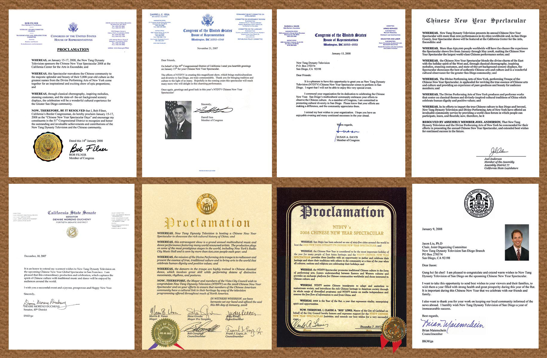 圣地亚哥县联邦、州、和地方各级官员纷纷颁发褒奖或发来贺信,盛赞新唐人电视台和神韵纽约艺术团为弘扬正统中国文化和正面的价值观、促进不同文化传统间的交流等方面所做出的卓越贡献。
