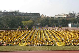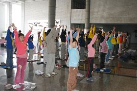 ![]() 交流会中也设立儿童组,分大班、小班、幼幼班,由几位有经验的学员带领一百多位小弟子,大家一起炼功、学法,做游戏。 |