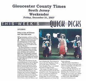 南新泽西的格罗切斯特郡(Gloucester)时报在其十二月二十一日的推荐娱乐版报导说,费城将以新唐人电视台的“全球华人新年晚会”揭开全世界最大的中国文化的庆典,一月四、五、六日晚在费城美丽安剧院进行演出。