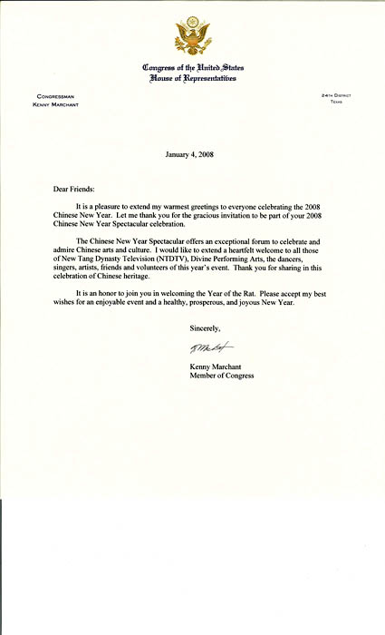 ![]() 美国国会议员肯尼.马辰特给全球华人新年晚会的贺信 |
