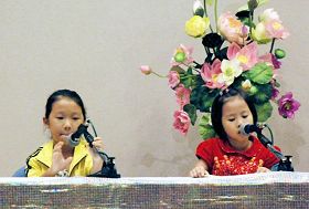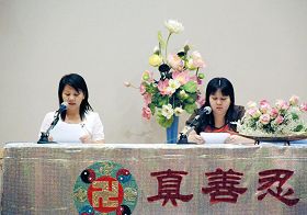在法会下午时间,明慧小弟子们上台背诵《转法轮》第六讲“主意识要强”一节,赢得了满场掌声。