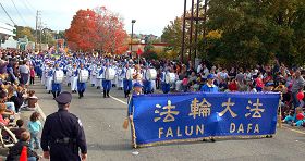 ![]() 法轮大法游行方队赢得观众的鼓掌和致意。 |