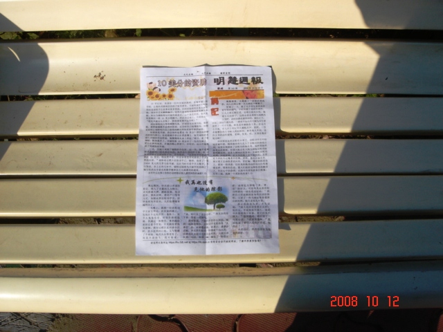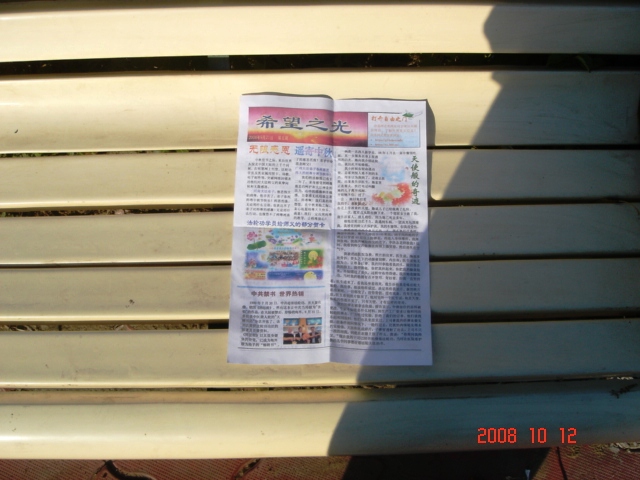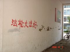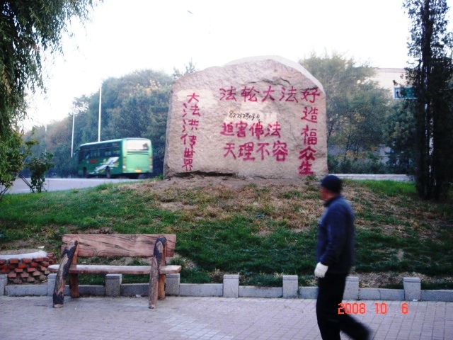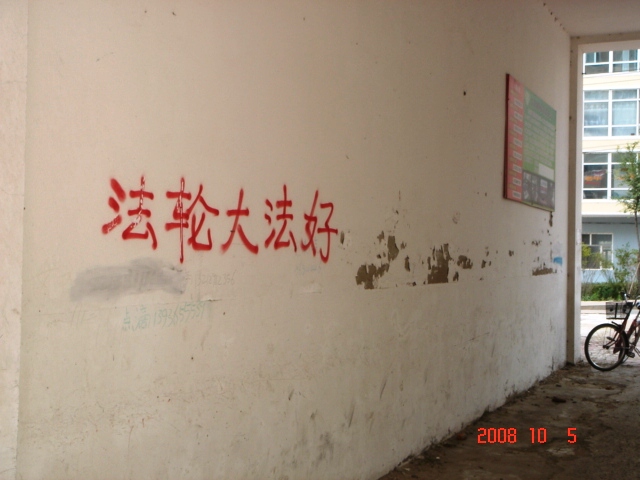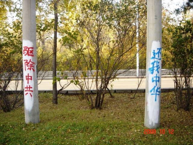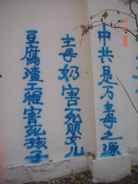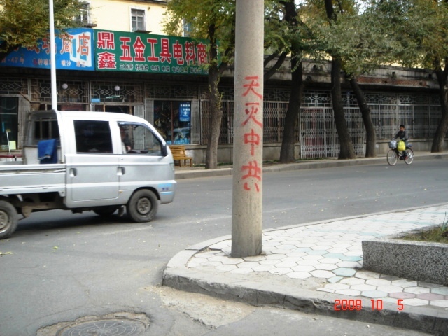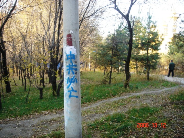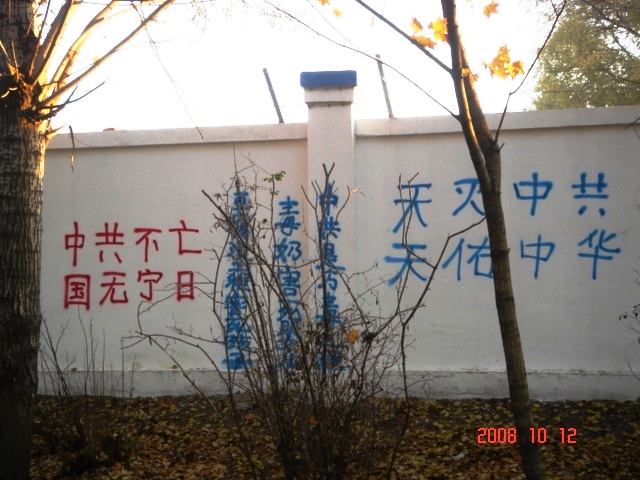 大陆北方某市出现大量退党标语,在公园的巨石上、在公园里的假山上、道路两边的电线杆上、围墙上、家属楼的墙上、大树上及体育广场的立柱上等地方出现喷漆和不干胶标语——喷漆喷出的标语有:“天灭中共 天佑中华”、“退党保命”、“声援四千三百万人退党”、“驱除中共恶党,还我中华”、“恶党不亡,国无宁日”、“法轮大法好”、“中共毒奶害死婴孩、豆腐渣工程害死灾区孩子、中共是万毒之源”、“平反法轮功,法办江泽民”等;不干胶上写着:“天灭中共灾难多,退出中共才平安”、“追查迫害法轮功的国际组织”公布天安门自焚案是一出重大的阴谋栽赃陷害!、“中国大陆公安国安迫害法轮功,恶报知多少?”、“中国三大冤案:文革、六四、迫害法轮功”、“老百姓觉醒了”及退党声明等。