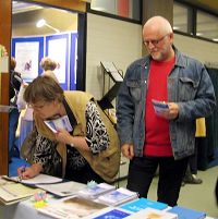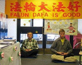 摊位上高悬着金黄色的“法轮大法好”横幅;法轮功学员伴着优美的炼功音乐,演示五套功法;桌上摆放着《法轮功》、《转法轮》等书籍及各种洪法讲真相资料。观众来时,学员们送上真相传单,还不时的递上一朵纸莲花,把法轮大法的美好和祝福带给人们。桌上还摆有征签簿,呼吁制止中共对法轮功的残酷迫害。前来参观的很多人主动签名。