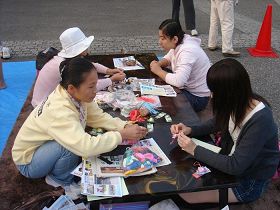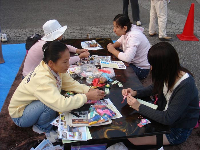 一名法轮功学员一边教日本女孩用彩纸折叠莲花,一边介绍说:“莲花在淤泥中生长,却很圣洁。你看,这个书签上有‘真、善、忍’三个字。真是说真话,善是有善良的心,忍是忍耐;你如果能够守住真、善、忍的话,会变成一个很优秀的孩子。炼功人按照‘真、善、忍’做好人,社会环境怎么变,他们还要做一个好人,即使受到迫害,还在守着他们的信念。”