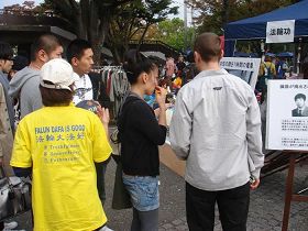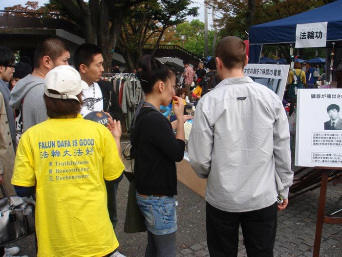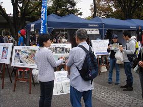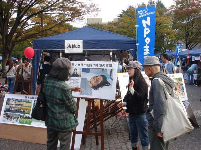 法轮功学员的舞台表演、受迫害图片展、义务教功和教授折叠莲花等活动都受到了大家的注目和欢迎。在法轮功展位上展出了法轮大法书籍,介绍材料等。许多人对法轮功受到中共迫害表示关注;在展位旁边还摆出了多幅法轮功学员在中国受到迫害的图片,吸引了许多人驻足观看。一位日本老人在看到了法轮功受迫害的图片之后表示:“中共比北韩恐怖,中共的专制体制不解体,始终是隐患。我支持你们(法轮功)。”