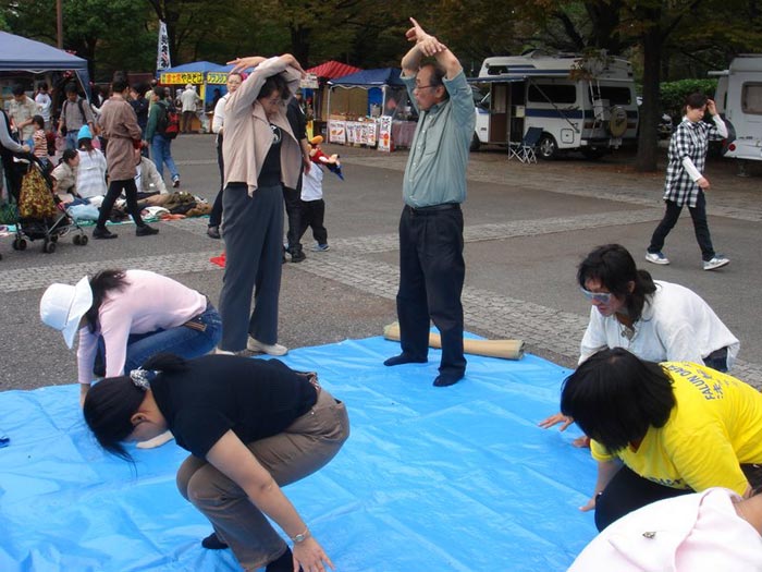 学员在展示功法时,不但引人驻足观看,有几名日本人当场开始学功。一名日本人歌手路过这里,被祥和的场面所吸引,并马上开始学习法轮功;在炼了一会儿之后,他感到很轻松。