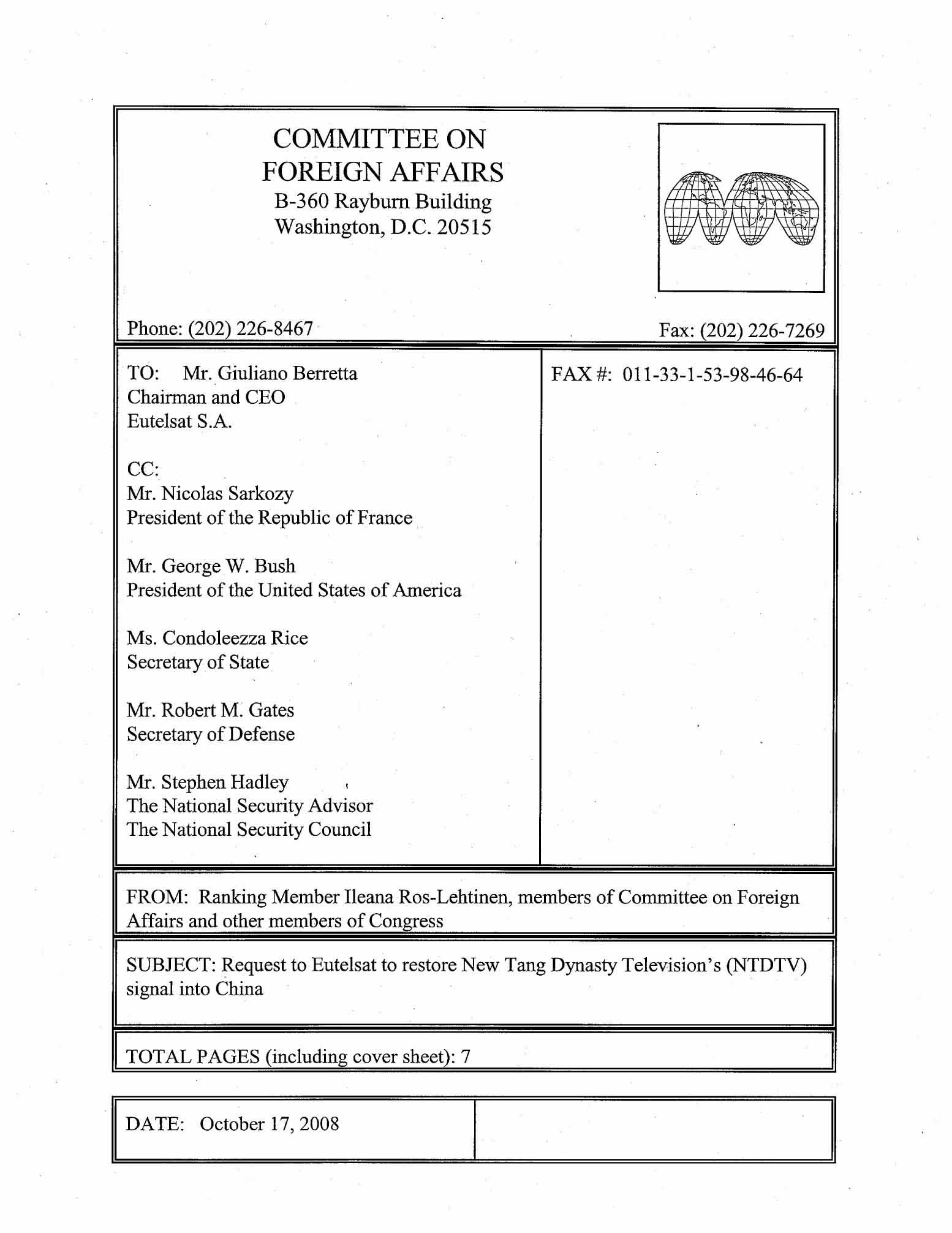 抄送法国总统萨科奇、美国总统布什、国务卿莱斯、国防部长盖茨、国家安全顾问哈德雷