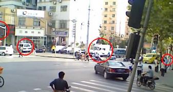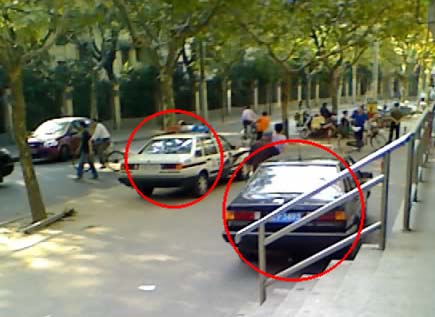 ![]() 在法院马路对面的警车和法院正门口的警察及和他说话的三名便衣(2男1女) | ![]() 在南丹路宜山路绕法院往返巡逻的恶警 |