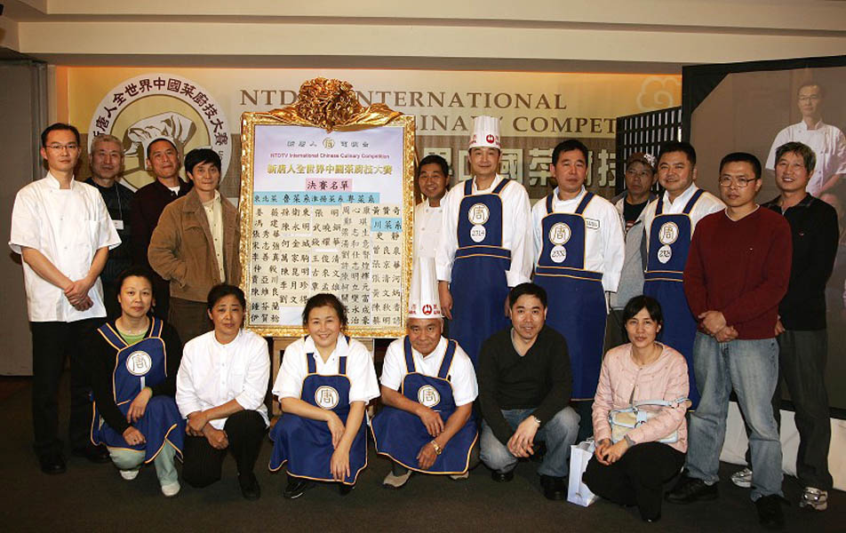 ![]() 新唐人中国菜厨技大赛北美赛区入围决赛的部份选手在金榜前合影 |