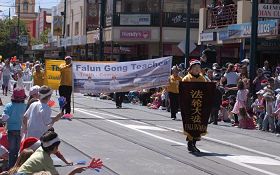 南澳法轮功团体应邀参加了游行, 更是此次游行的亮点之一。身着中国唐代服饰和仙女服饰的女子端坐在花车中,祥和宁静的展示法轮功功法,深深吸引了观众的目光;高音喇叭介绍着法轮大法“真、善、忍”的法理,引来阵阵掌声;人们纷纷举起相机、摄影机和手机拍下这优美的瞬间。