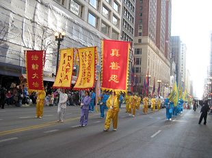 ![]() 美中法轮大法学会在二零零八年十一月二十七芝加哥感恩节游行中的“大唐”旗队 |